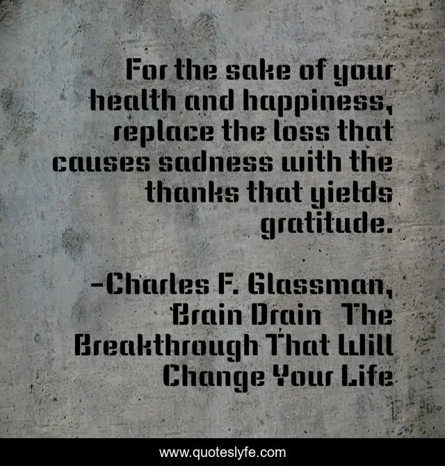 This page presents the quote "For the sake of your health and happiness, replace the loss that causes sadness with the thanks that yields gratitude.". Author of this quote is Charles F. Glassman, Brain Drain The Breakthrough That Will Change Your Life. This quote is about gratitude, enthusiasm, happiness, inspirational,.