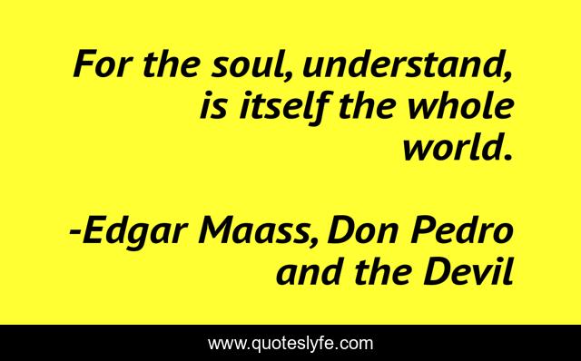 This page presents the quote "For the soul, understand, is itself the whole world.". Author of this quote is Edgar Maass, Don Pedro and the Devil. This quote is about spirituality, philosophy, spiritual-wisdom,.