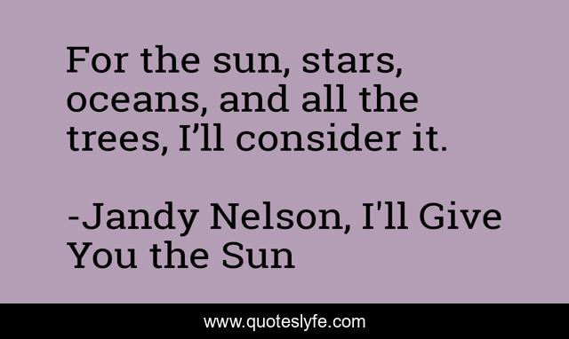 This page presents the quote "For the sun, stars, oceans, and all the trees, I’ll consider it.". Author of this quote is Jandy Nelson, I'll Give You the Sun. This quote is about stars, trees, nature,.