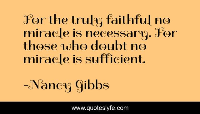 This page presents the quote "For the truly faithful no miracle is necessary. For those who doubt no miracle is sufficient.". Author of this quote is Nancy Gibbs. This quote is about faith, unity,.