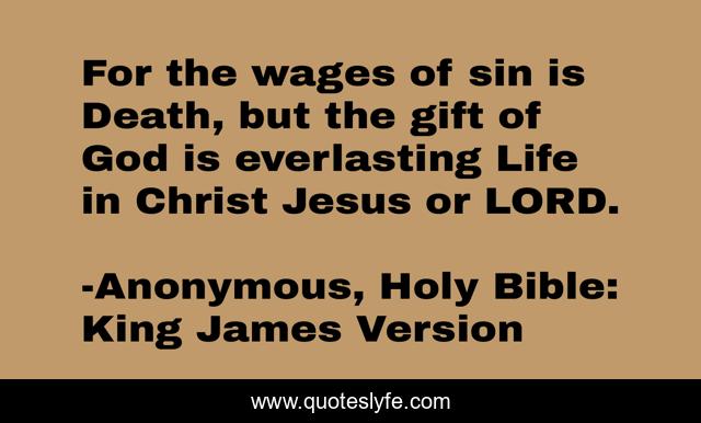 This page presents the quote "For the wages of sin is Death, but the gift of God is everlasting Life in Christ Jesus or LORD.". Author of this quote is Anonymous, Holy Bible: King James Version. This quote is about religion, bible,.