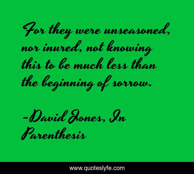 This page presents the quote "For they were unseasoned, nor inured, not knowing this to be much less than the beginning of sorrow.". Author of this quote is David Jones, In Parenthesis. This quote is about military, wwi, war, soldiers,.