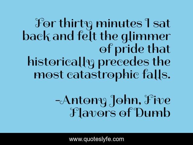 This page presents the quote "For thirty minutes I sat back and felt the glimmer of pride that historically precedes the most catastrophic falls.". Author of this quote is Antony John, Five Flavors of Dumb. This quote is about failure, pride, humor,.