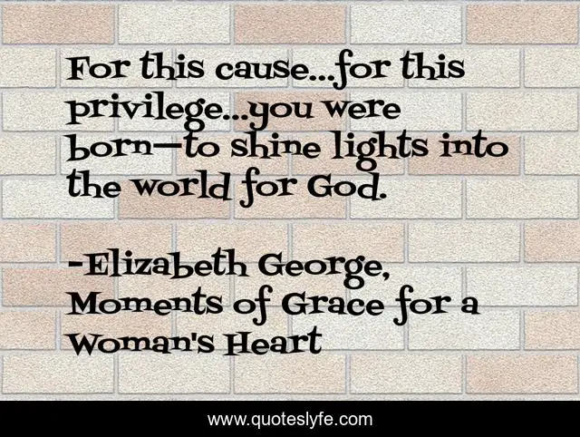 This page presents the quote "For this cause…for this privilege…you were born—to shine lights into the world for God.". Author of this quote is Elizabeth George, Moments of Grace for a Woman's Heart. This quote is about shine, christian, god, elizabeth-george, world, women,.