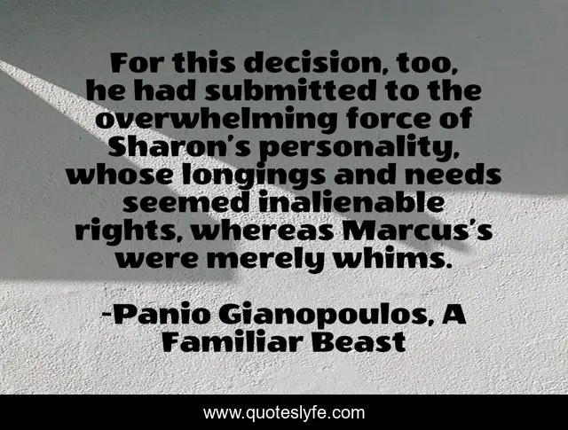 This page presents the quote "For this decision, too, he had submitted to the overwhelming force of Sharon’s personality, whose longings and needs seemed inalienable rights, whereas Marcus’s were merely whims.". Author of this quote is Panio Gianopoulos, A Familiar Beast. This quote is about husbands, relationships, literature, marriage,.