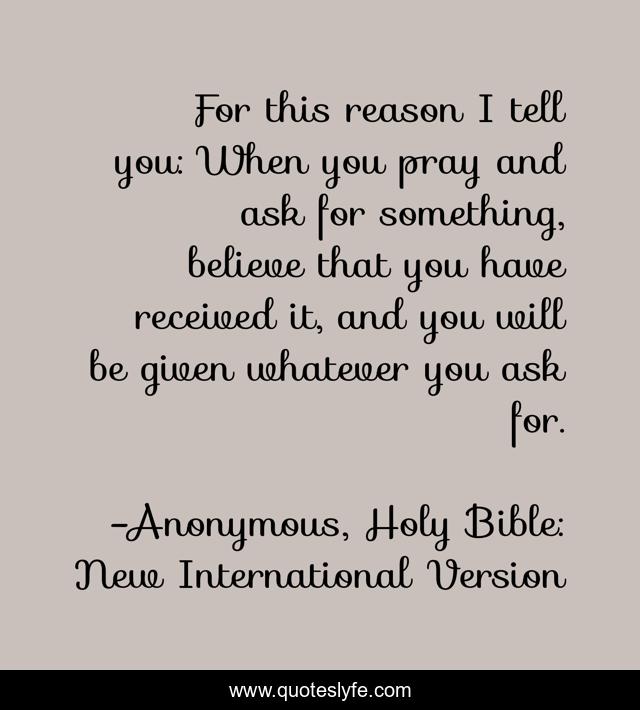 This page presents the quote "For this reason I tell you: When you pray and ask for something, believe that you have received it, and you will be given whatever you ask for.". Author of this quote is Anonymous, Holy Bible: New International Version. .