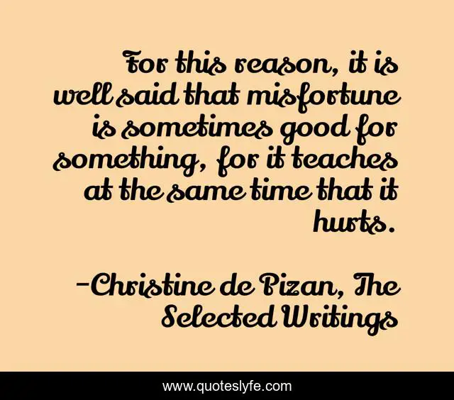 This page presents the quote "For this reason, it is well said that misfortune is sometimes good for something, for it teaches at the same time that it hurts.". Author of this quote is Christine de Pizan, The Selected Writings. This quote is about perseverance, misfortune, pain, redemption, sorrow, hopeful, grief, mistakes, hopelessness,.