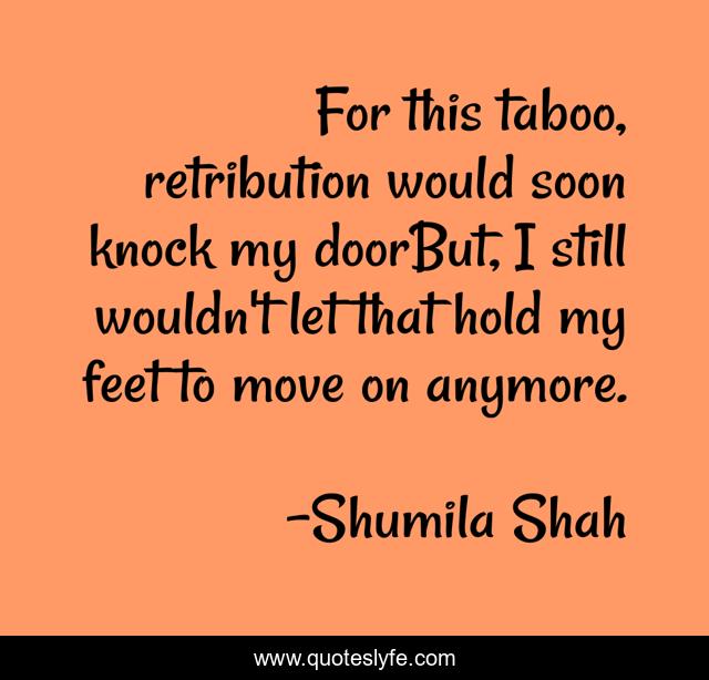 This page presents the quote "For this taboo, retribution would soon knock my doorBut, I still wouldn't let that hold my feet to move on anymore.". Author of this quote is Shumila Shah. This quote is about dedication, behaviour, attitude, dedication-and-attitude, dedications,.