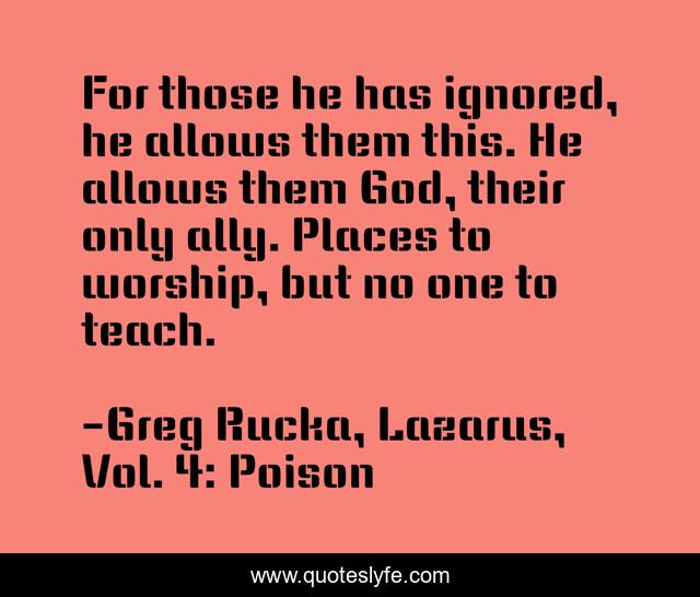 This page presents the quote "For those he has ignored, he allows them this. He allows them God, their only ally. Places to worship, but no one to teach.". Author of this quote is Greg Rucka, Lazarus, Vol. 4: Poison. This quote is about atheism, god, church, abandonment, poison, arrogance, nun, lazarus, greg-rucka,.