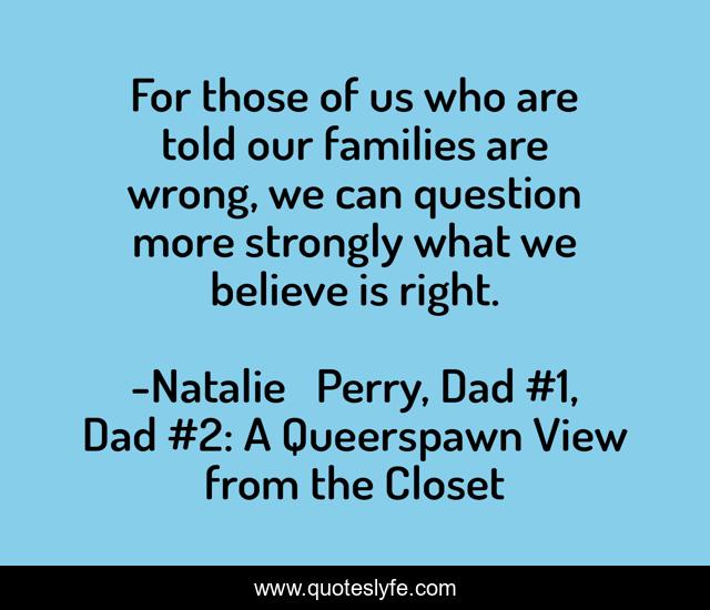 This page presents the quote "For those of us who are told our families are wrong, we can question more strongly what we believe is right.". Author of this quote is Natalie Perry, Dad #1, Dad #2: A Queerspawn View from the Closet. This quote is about lgbtq, family, identity,.