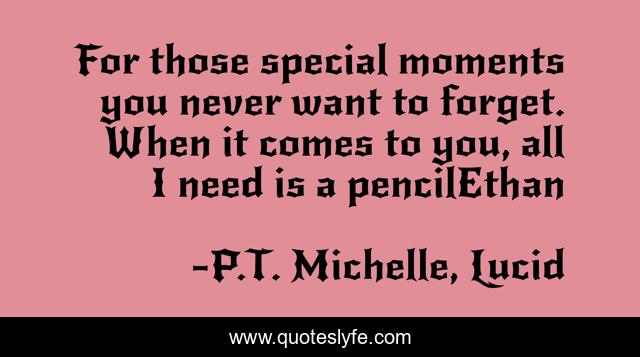 "P.T. Michelle, Lucid Quotes." Quoteslyfe.com, 2025. Tue. 09 Dec. 2025. <https://www.quoteslyfe.com/quote/For-those-special-moments-you-never-want-171968>.