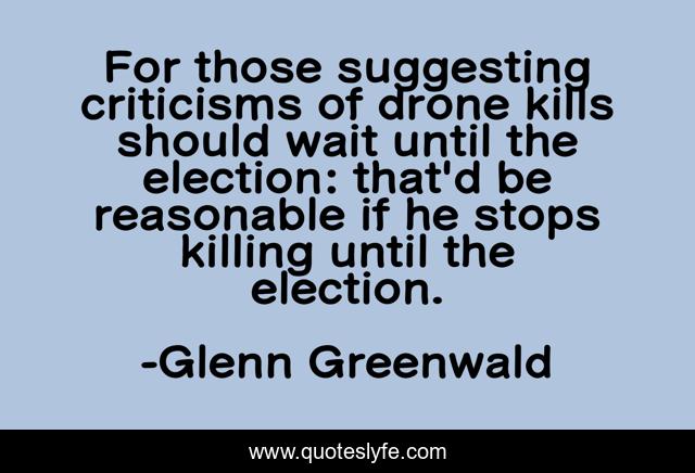 This page presents the quote "For those suggesting criticisms of drone kills should wait until the election: that'd be reasonable if he stops killing until the election.". Author of this quote is Glenn Greenwald. This quote is about drone-attacks-in-pakistan, us-presidential-election-2012, twitter, unmanned-aerial-vehicles, barack-obama, united-states, politics, 2012,.