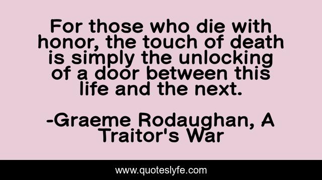 This page presents the quote "For those who die with honor, the touch of death is simply the unlocking of a door between this life and the next.". Author of this quote is Graeme Rodaughan, A Traitor's War. This quote is about death, honor,.