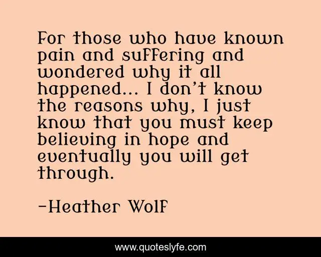 This page presents the quote "For those who have known pain and suffering and wondered why it all happened... I don’t know the reasons why, I just know that you must keep believing in hope and eventually you will get through.". Author of this quote is Heather Wolf. This quote is about pain, suffering, reasons-why, quotes-about-life, quotes-to-live-by, believe, hope,.