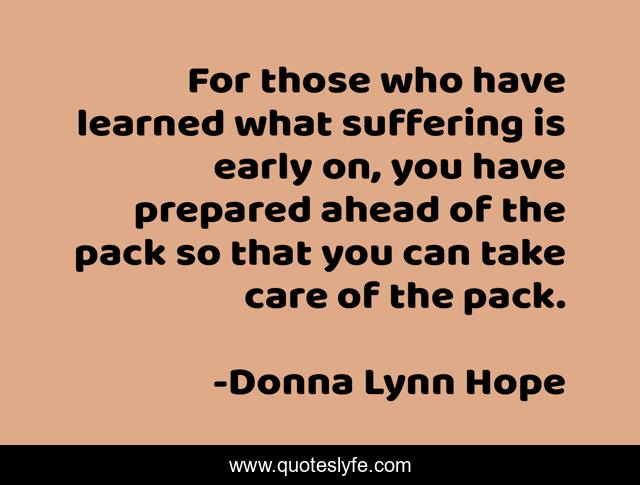 This page presents the quote "For those who have learned what suffering is early on, you have prepared ahead of the pack so that you can take care of the pack.". Author of this quote is Donna Lynn Hope. This quote is about protective, strength, suffering, lead, leaders,.