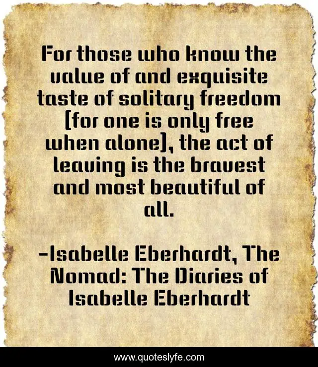 This page presents the quote "For those who know the value of and exquisite taste of solitary freedom (for one is only free when alone), the act of leaving is the bravest and most beautiful of all.". Author of this quote is Isabelle Eberhardt, The Nomad: The Diaries of Isabelle Eberhardt. This quote is about freedom, loneliness, solitude, inspirational, enthusiasm, bravery,.