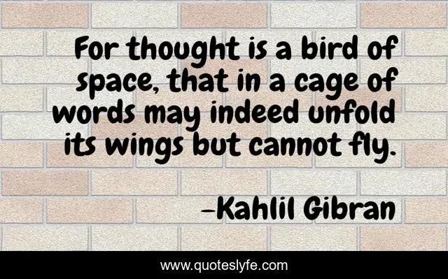 This page presents the quote "For thought is a bird of space, that in a cage of words may indeed unfold its wings but cannot fly.". Author of this quote is Kahlil Gibran. This quote is about thought, communication, bird,.