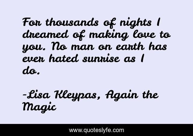 This page presents the quote "For thousands of nights I dreamed of making love to you. No man on earth has ever hated sunrise as I do.". Author of this quote is Lisa Kleypas, Again the Magic. .