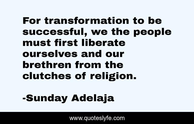 This page presents the quote "For transformation to be successful, we the people must first liberate ourselves and our brethren from the clutches of religion.". Author of this quote is Sunday Adelaja. This quote is about religion, liberate, transformation,.
