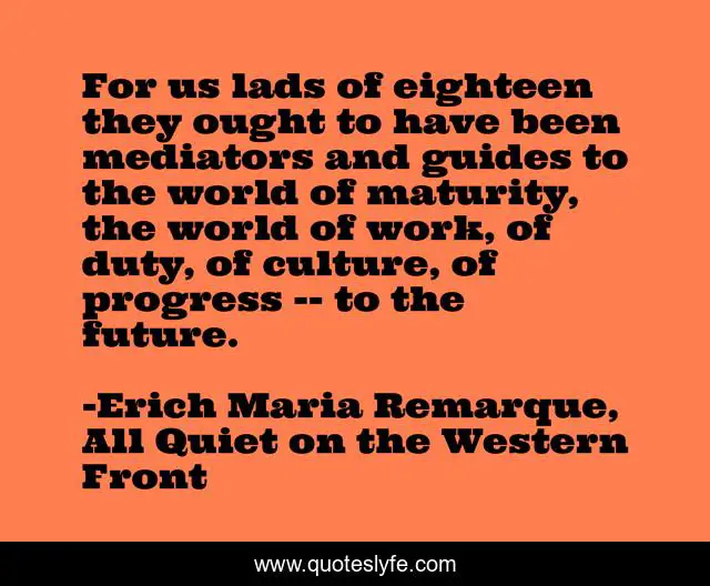 This page presents the quote "For us lads of eighteen they ought to have been mediators and guides to the world of maturity, the world of work, of duty, of culture, of progress -- to the future.". Author of this quote is Erich Maria Remarque, All Quiet on the Western Front. This quote is about maturity, age, war, wisdom,.
