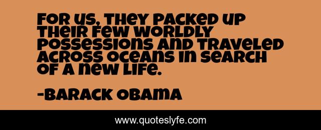 This page presents the quote "For us, they packed up their few worldly possessions and traveled across oceans in search of a new life.". Author of this quote is Barack Obama. This quote is about enthusiasm, trust, immigration, inspirational,.