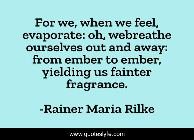 This page presents the quote "For we, when we feel, evaporate: oh, webreathe ourselves out and away: from ember to ember, yielding us fainter fragrance.". Author of this quote is Rainer Maria Rilke. .