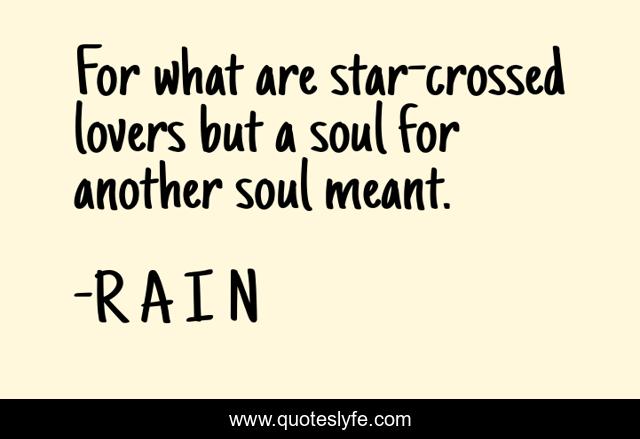 This page presents the quote "For what are star-crossed lovers but a soul for another soul meant.". Author of this quote is R A I N. This quote is about romeo-and-juliet, lovers, love, star-crossed-lovers, rain, affection,.
