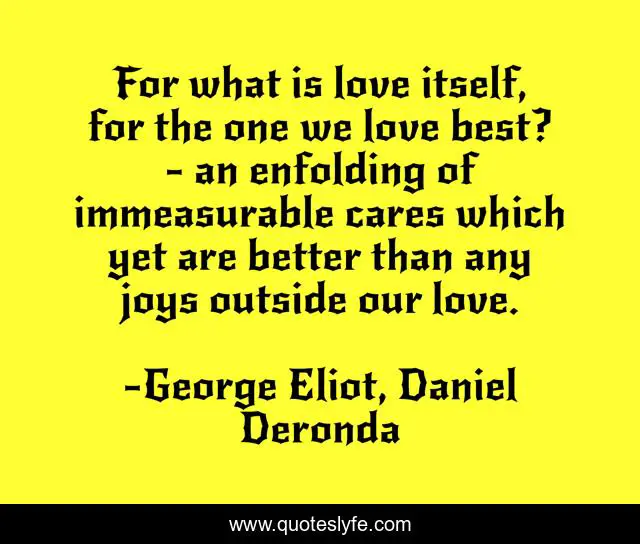 This page presents the quote "For what is love itself, for the one we love best? - an enfolding of immeasurable cares which yet are better than any joys outside our love.". Author of this quote is George Eliot, Daniel Deronda. This quote is about joy, sacrifice, love, affection, care,.