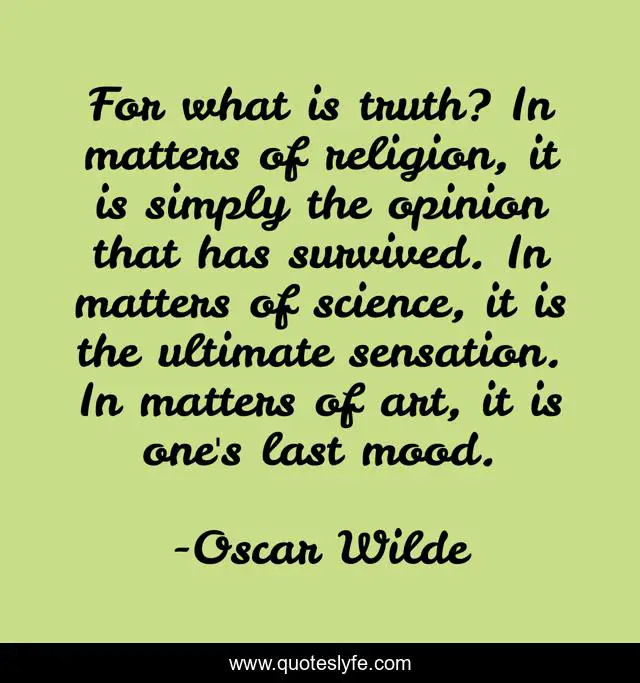 This page presents the quote "For what is truth? In matters of religion, it is simply the opinion that has survived. In matters of science, it is the ultimate sensation. In matters of art, it is one's last mood.". Author of this quote is Oscar Wilde. This quote is about religion, art,.
