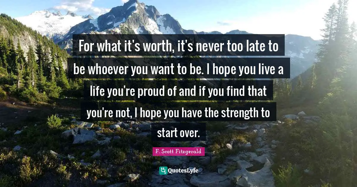 This page presents the quote "For what it's worth, it's never too late to be whoever you want to be. I hope you live a life you're proud of and if you find that you're not, I hope you have the strength to start over.". Author of this quote is F. Scott Fitzgerald. This quote is about too late, proud, life, strength, never too late, hope, buttons, want, starting over,.