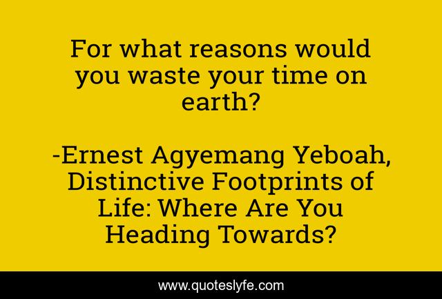 This page presents the quote "For what reasons would you waste your time on earth?". Author of this quote is Ernest Agyemang Yeboah, Distinctive Footprints of Life: Where Are You Heading Towards?. This quote is about brainy, thinking, purpose, inspirational, time, enthusiasm, purpose-of-life,.