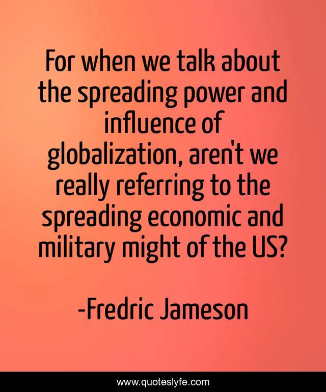 This page presents the quote "For when we talk about the spreading power and influence of globalization, aren't we really referring to the spreading economic and military might of the US?". Author of this quote is Fredric Jameson. This quote is about military, influence,.