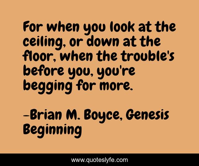 This page presents the quote "For when you look at the ceiling, or down at the floor, when the trouble's before you, you're begging for more.". Author of this quote is Brian M. Boyce, Genesis Beginning. This quote is about god, philosphy, courage, genesis, religion,.