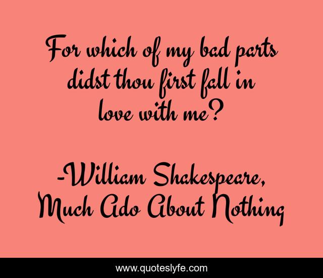 This page presents the quote "For which of my bad parts didst thou first fall in love with me?". Author of this quote is William Shakespeare, Much Ado About Nothing. This quote is about love, affection,.