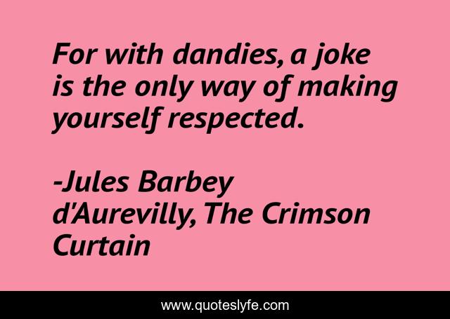 This page presents the quote "For with dandies, a joke is the only way of making yourself respected.". Author of this quote is Jules Barbey d'Aurevilly, The Crimson Curtain. This quote is about dandy, irony, joke, humor, respect,.