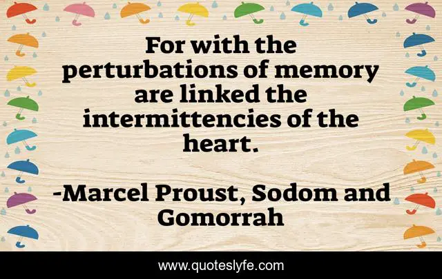 This page presents the quote "For with the perturbations of memory are linked the intermittencies of the heart.". Author of this quote is Marcel Proust, Sodom and Gomorrah. This quote is about heart, memory,.