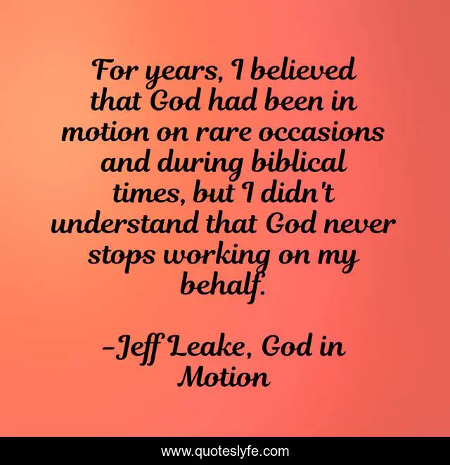 This page presents the quote "For years, I believed that God had been in motion on rare occasions and during biblical times, but I didn't understand that God never stops working on my behalf.". Author of this quote is Jeff Leake, God in Motion. This quote is about spiritual-growth, christian,.