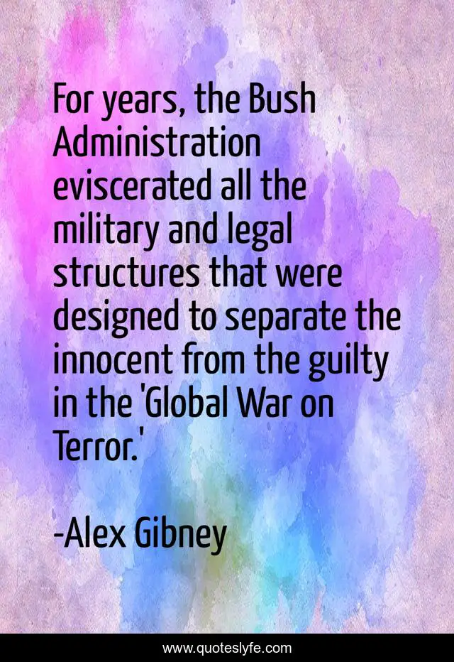 This page presents the quote "For years, the Bush Administration eviscerated all the military and legal structures that were designed to separate the innocent from the guilty in the 'Global War on Terror.'". Author of this quote is Alex Gibney. This quote is about military, guilty, war,.
