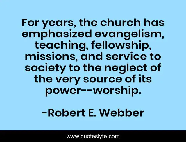 This page presents the quote "For years, the church has emphasized evangelism, teaching, fellowship, missions, and service to society to the neglect of the very source of its power--worship.". Author of this quote is Robert E. Webber. This quote is about god, christianity, inspirational, enthusiasm, jesus, worship,.