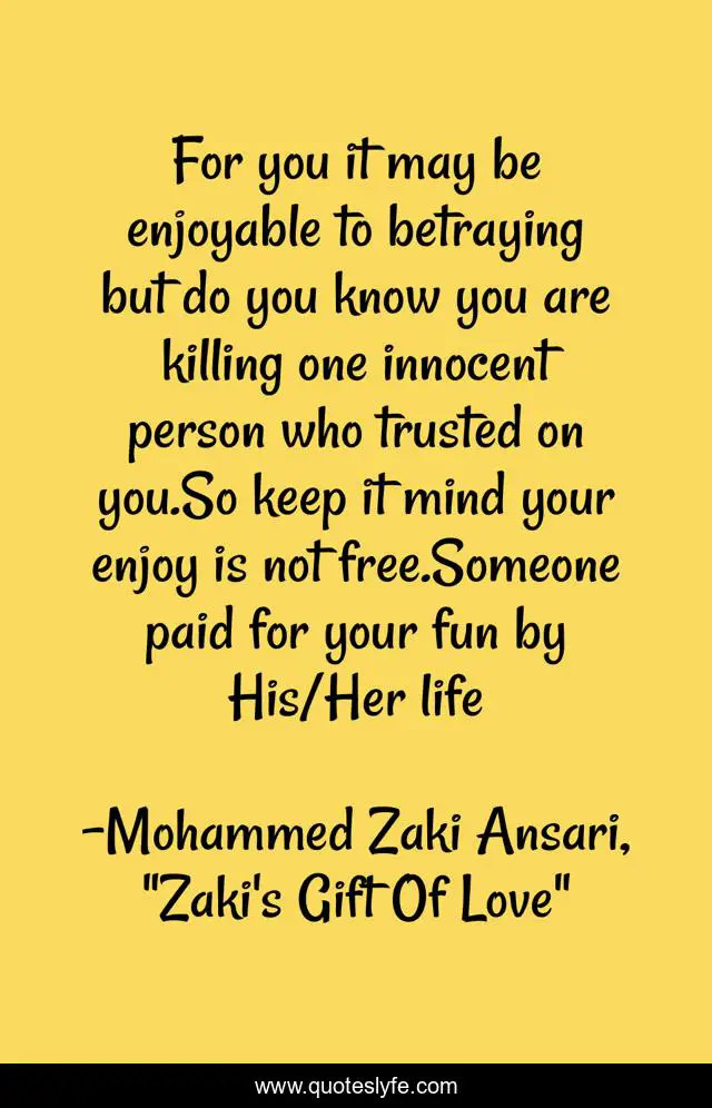 This page presents the quote "For you it may be enjoyable to betraying but do you know you are killing one innocent person who trusted on you.So keep it mind your enjoy is not free.Someone paid for your fun by His/Her life". Author of this quote is Mohammed Zaki Ansari, "Zaki's Gift Of Love". This quote is about betrayal, life, love, affection,.
