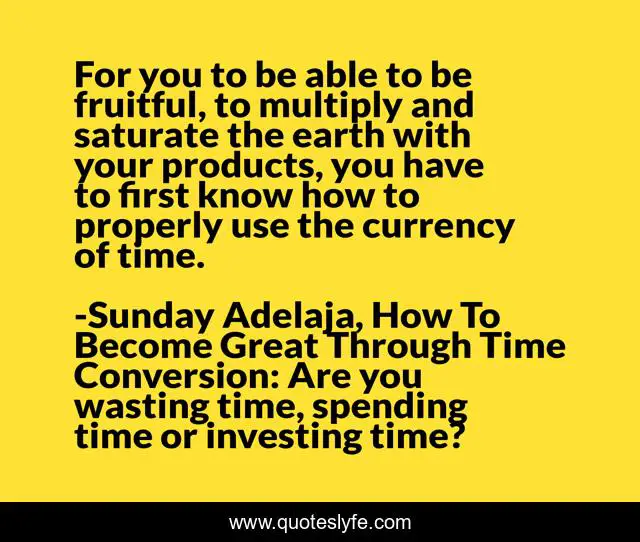 This page presents the quote "For you to be able to be fruitful, to multiply and saturate the earth with your products, you have to first know how to properly use the currency of time.". Author of this quote is Sunday Adelaja, How To Become Great Through Time Conversion: Are you wasting time, spending time or investing time?. This quote is about time-management, product, currency, earth, conversion, productivity, wealth, saturation, greatness,.