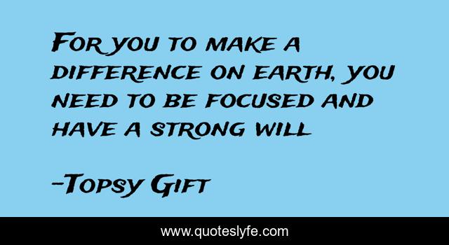 This page presents the quote "For you to make a difference on earth, you need to be focused and have a strong will". Author of this quote is Topsy Gift. This quote is about need, difference, focused, strong,.