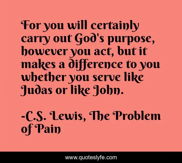 This page presents the quote "For you will certainly carry out God's purpose, however you act, but it makes a difference to you whether you serve like Judas or like John.". Author of this quote is C.S. Lewis, The Problem of Pain. This quote is about god, free-will, john, judas,.
