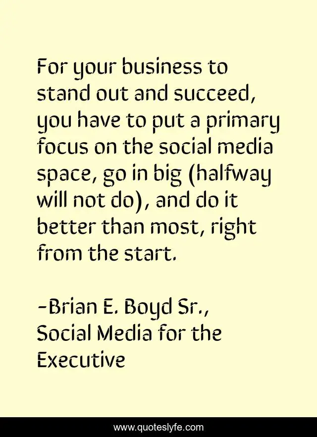 This page presents the quote "For your business to stand out and succeed, you have to put a primary focus on the social media space, go in big (halfway will not do), and do it better than most, right from the start.". Author of this quote is Brian E. Boyd Sr., Social Media for the Executive. This quote is about social-media, management, business-advice, business, marketing, executive, advertising,.
