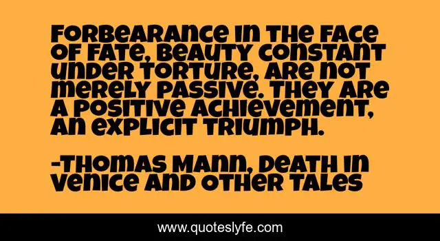 This page presents the quote "Forbearance in the face of fate, beauty constant under torture, are not merely passive. They are a positive achievement, an explicit triumph.". Author of this quote is Thomas Mann, Death in Venice and Other Tales. This quote is about philosophy, love, affection, inspiration,.