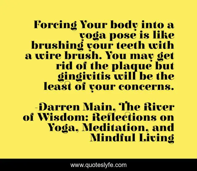 This page presents the quote "Forcing Your body into a yoga pose is like brushing your teeth with a wire brush. You may get rid of the plaque but gingivitis will be the least of your concerns.". Author of this quote is Darren Main, The River of Wisdom: Reflections on Yoga, Meditation, and Mindful Living. This quote is about meditation, yoga, mindfulness,.