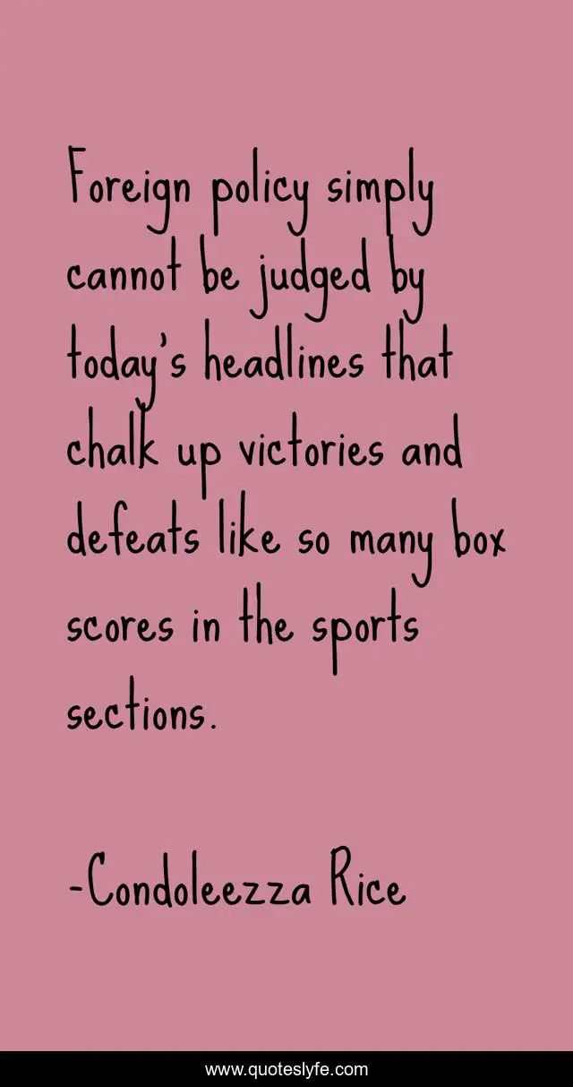 This page presents the quote "Foreign policy simply cannot be judged by today's headlines that chalk up victories and defeats like so many box scores in the sports sections.". Author of this quote is Condoleezza Rice. This quote is about box, up, today,.