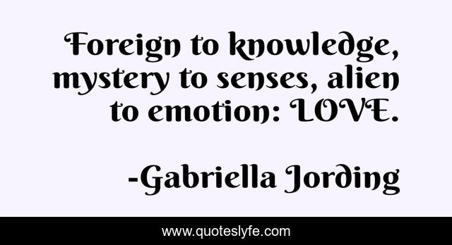 This page presents the quote "Foreign to knowledge, mystery to senses, alien to emotion: LOVE.". Author of this quote is Gabriella Jording. This quote is about emotion, mystery, senses, love, knowledge, foreign, alien, affection,.
