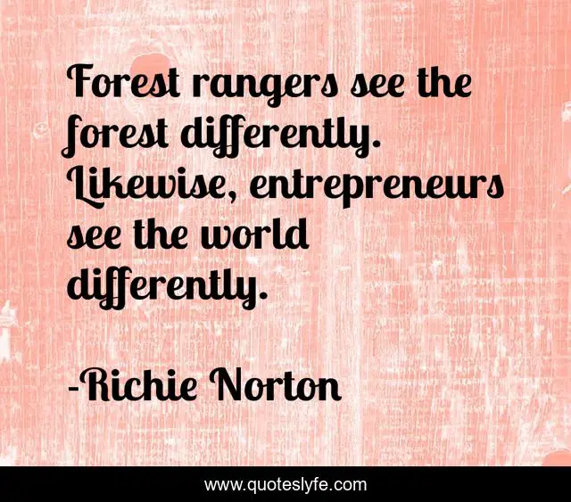 This page presents the quote "Forest rangers see the forest differently. Likewise, entrepreneurs see the world differently.". Author of this quote is Richie Norton. This quote is about confidence, self-mastery, mindful, marketing, work, success, self-help, entrepreneur, innovation,.