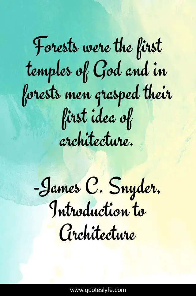 This page presents the quote "Forests were the first temples of God and in forests men grasped their first idea of architecture.". Author of this quote is James C. Snyder, Introduction to Architecture. This quote is about midieval, art, architecture,.
